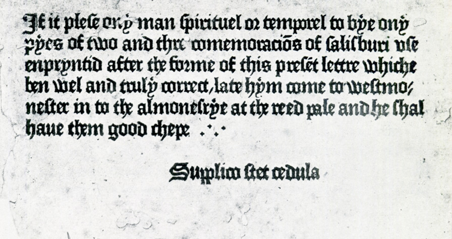 Caxton Advertisement 1479 Published August 29, 2012 at 896 × 474 in History of Job Printing Caxton’s advertisement for his Ordinale Sarum, 1479. The first printed advertisement (and poster) in English. The type is Caxton’s Type 3. Continue reading → Contributors Harold Kyle, Developer